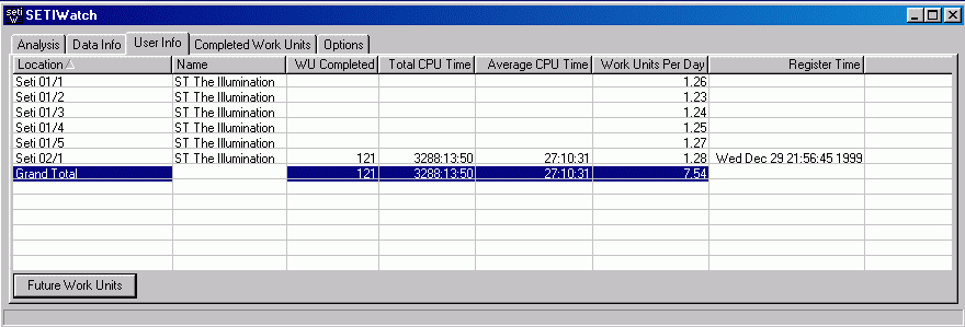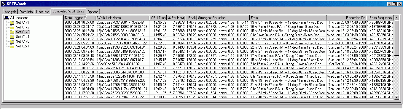 Wer Seti Log installiert hat sieht hier alle WU´s mit Ihren wichtigsten Daten die seit der Installation von Seti Log berechnet wurden.
