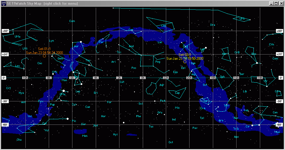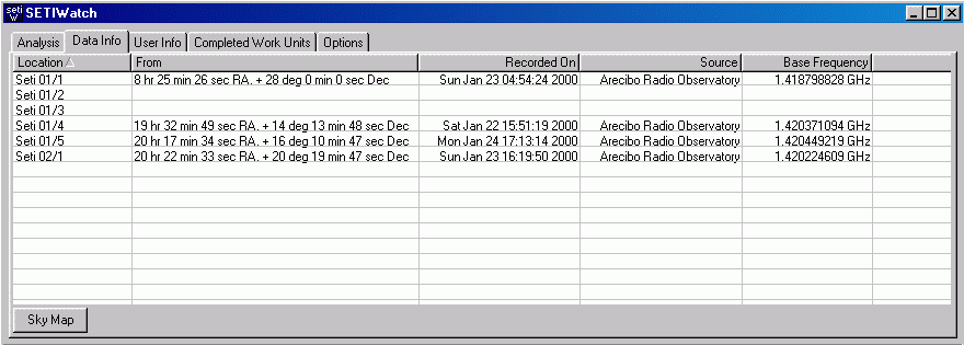 Klickt man eine WU an und betätigt die rechte Maustaste kann man sich die WU auf der Sternenkarte anschauen. Wer Seti Log nicht installiert hat, wird mit einem leeren Fenster und der Meldung, dass Seti Log nicht installiert bzw. eine SetiLog Datei nicht gefunden werden konnte enttäuscht. Es wird gefragt ob Seti Log geladen werden soll. Seti Log ist ein Zusatztool was sich die bereits berechneten WUs merkt. Man bekommt es auf den SETIWatch Seiten http://members.shaw.ca/mloukko/SETI.html und es arbeitet nur mit dem Textclient zusammen. Der Einsatz von SETILog ist sehr einfach. Die SETILog.exe muss in das Clientverzeichnis kopiert werden. Nun muss man nicht mehr den Client sondern immer die SETILog.exe zum rechnen starten. SETILog startet dann automatisch den seti Client und protokolliert alles mit. Der Client muss aber den orginalen Namen haben (z.B. setiathome-3.08.i386-winnt-cmdline.exe). Nun muss eine WU komplett durchgerechnet werden und dann erscheinen die ersten Logeinträge in der SETILog.csv die SETIWatch dann auswerten kann.